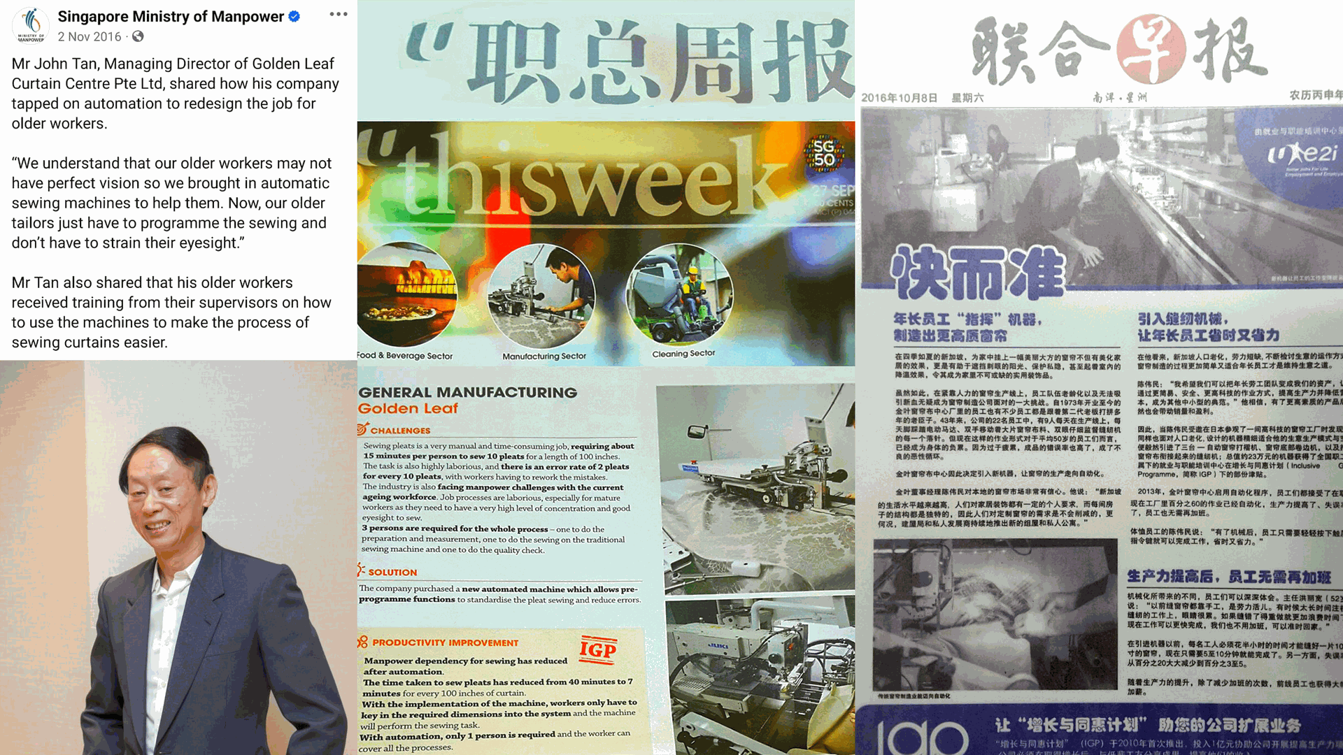 In 2013, the business begin importing machineries from Japan for the manufacturing its curtains. This allowed its aging workforce to continue their job with less burden and allowed the business to diversify its workforce to others who may not had sewing experience. As a result, Golden Leaf Curtain Centre was featured in several media such as Mediacorps's 2016 "Please Be My Guest !" and the Chinese Newspaper, Lianhe Zhaobao (联合早报). Golden Leaf Curtain Centre was also featured as an exemplary employer under WDA (Workforce Singapore) at the annual Age Management Seminar.